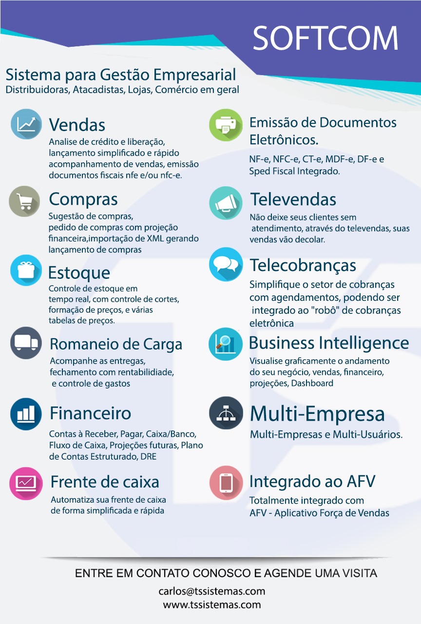Estoque, Compras, Vendas, Financeiro, Caixa, PDV, Boletos, NFe, NFce, MDFe, DFe e CTe